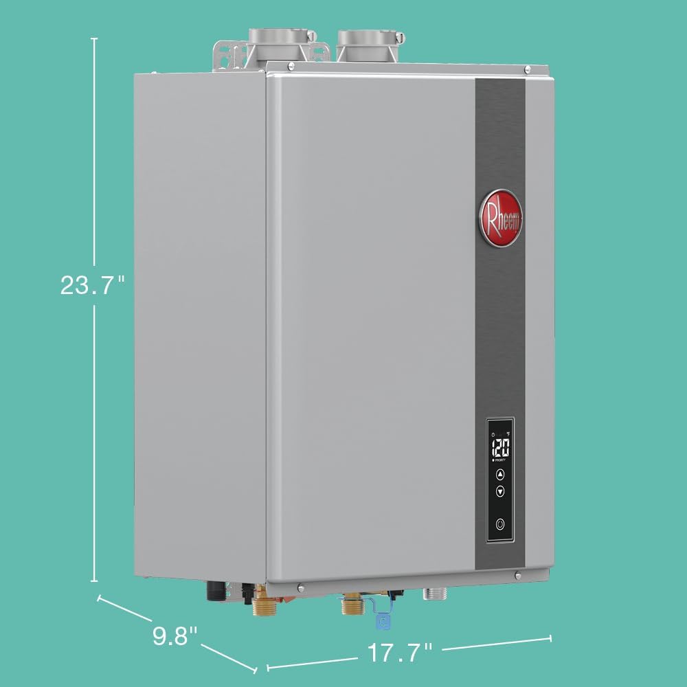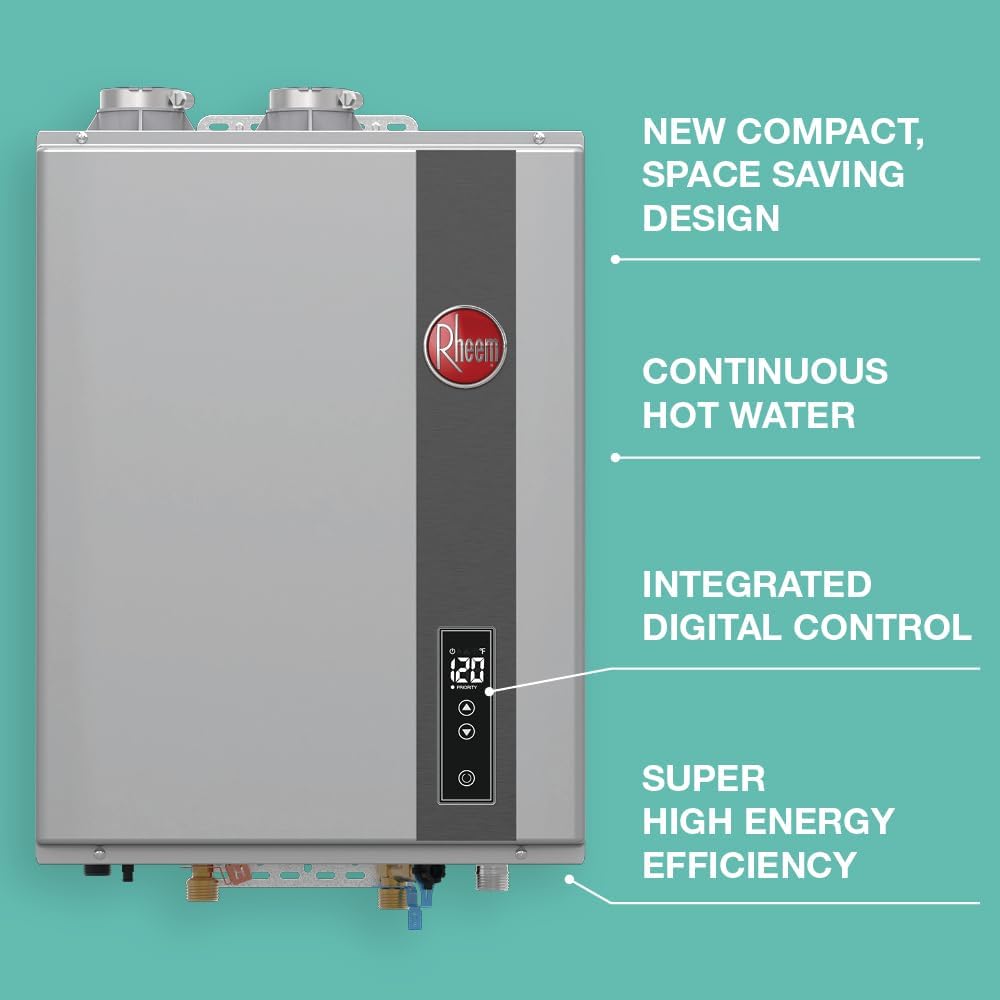 The Rheem RTGH-95DVLN-3 Super High Efficiency indoor natural gas tankless water heater delivers continuous hot water with minimal wait, saving you time, energy and water. The RTGH-95DVLN-3 features Hot Start Programming which keeps the water heater in a ready state eliminating cold water bursts with back-to-back uses. The RTGH series enhanced design is up to 20% smaller and lighter making one-person installs even easier. The compact size, wall mount, and industry leading installation clearance allows for installation in small spaces, saving valuable floor space.